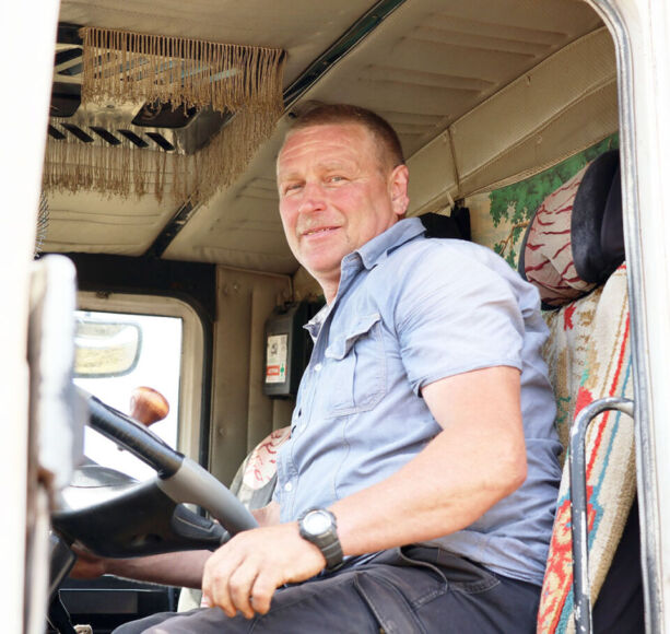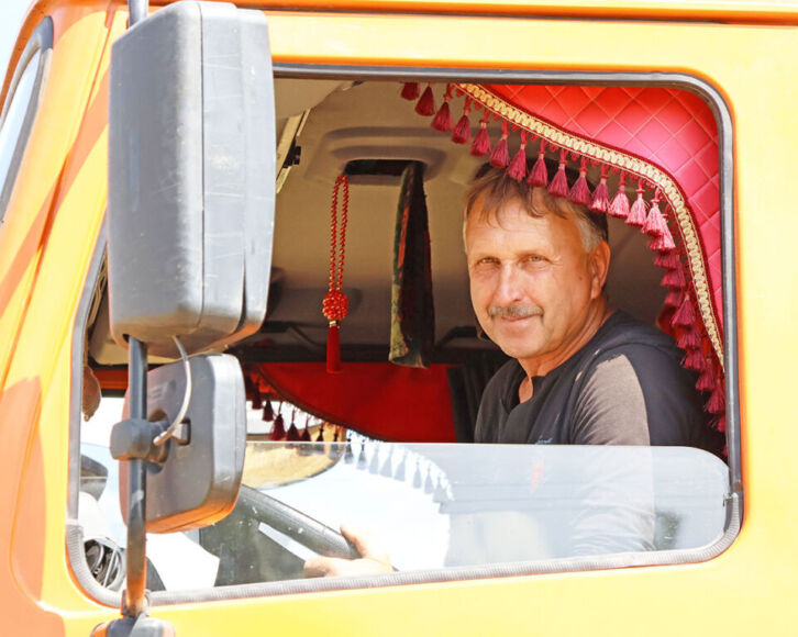 На отвозке урожая на большегрузном МАЗе занят опытный водитель Василий Климков. К слову, Василий Анатольевич в предыдущие сезоны уборочной неоднократно преодолевал тысячный рубеж на перевозке зерна по маршруту «поле-ток».