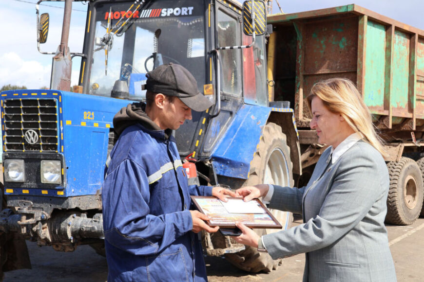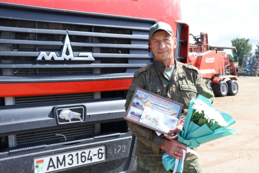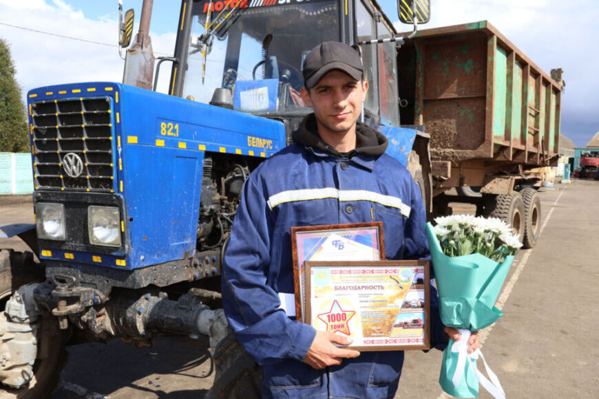 Первым поздравления принимал водитель-«двухтысячник» Сергей Гарючко. В данном сельхозпредприятии Сергей Владимирович работает первый год, что не помешало ему с первой же уборочной кампании выйти в лидеры трудового соревнования. Кажется, ещё недавно его поздравляли с перевезённой от комбайнов тысячей тонн зерна и рапса, как уже достигнута и более почётная двухтысячная планка. Передовому труженику вручена письменная благодарность районного исполнительного комитета, цветы и денежная премия от хозяйства и отраслевого профсоюза, а также наклейка с заветными цифрами «2000 тонн».