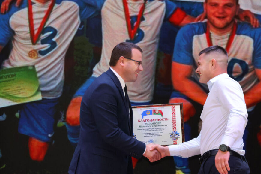 «спорту» – в рамках этого блока поздравления принимали победители   чемпионата Республики Беларусь среди команд второй лиги Могилевского дивизиона – игроки ФК «Заря» (Круглое). Письменными благодарностями районного Совета депутатов отмечены: Дмитрий Сыманович и Максим Сазонов. Подарок от ФК «Заря» вручен самой активной постоянной болельщице, не пропустившей за 4 года ни одного матча Надежде Красницкой.