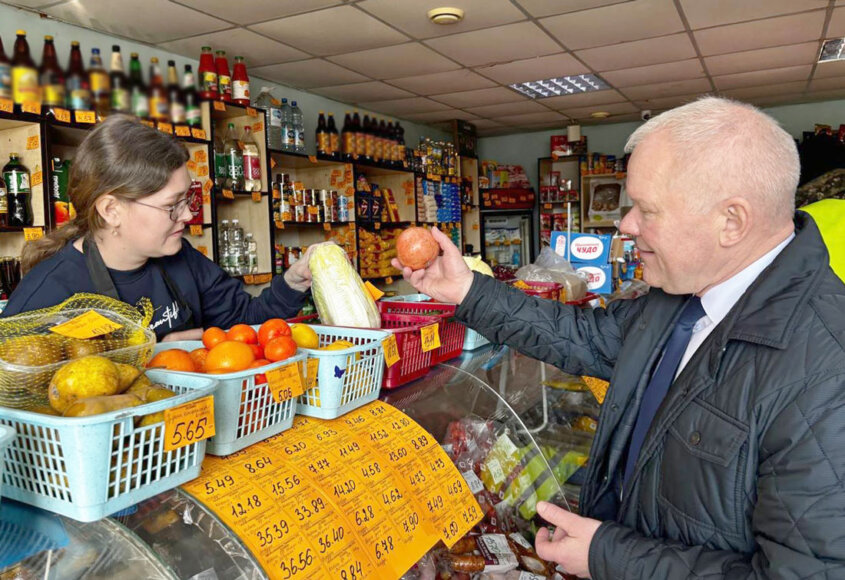 Проверка начинается с изучения витрин с товарами первой необходимости. Молоко, хлеб, сахар, подсолнечное масло… Депутат сверяет ценники на полках с установленными нормами.