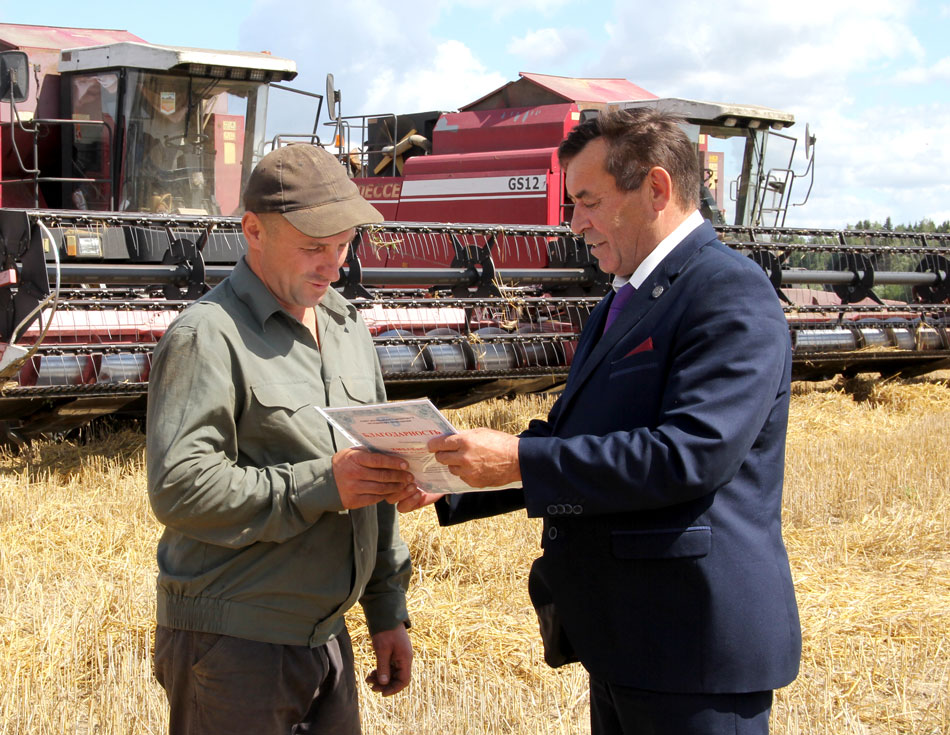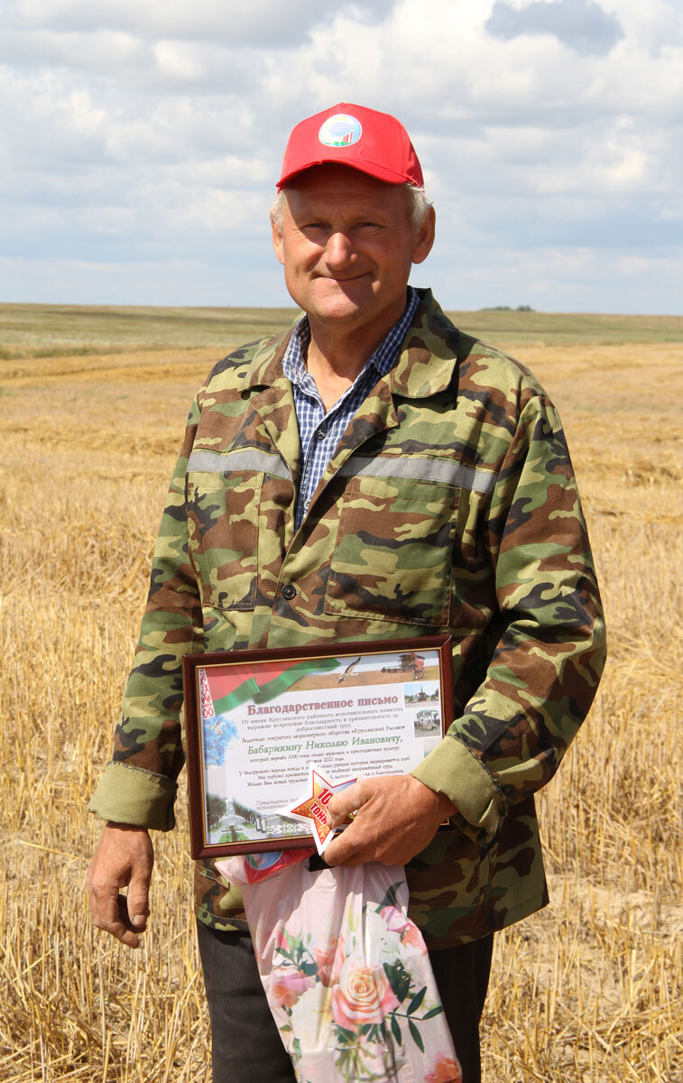 В этом году Н. Бабарикин снова отмечен в числе транспортников, первыми превзошедших тысячный рубеж. На своем ГАЗ-САЗ-35071 по маршруту поле-ток по состоянию на утро 3 августа он перевез 1514 т рапса и зерна. Поздравили Николая Ивановича с очередным трудовым достижением непосредственно в поле. Благодарственное письмо районного исполнительного комитета ему вручил председатель райкома профсоюза работников АПК Владимир Сошко. А в дополнение к письму – денежная премия от руководства хозяйства, традиционные кепка и футболка с логотипом отраслевого проф- союза и подарки от РОО «Белая Русь».