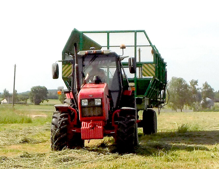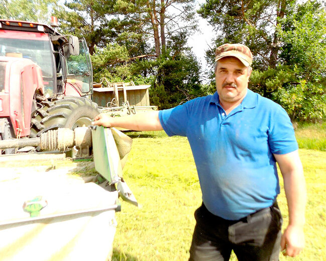На косьбе на тракторе «Беларус-3522» с косилкой-КМР-9 задействован ответственный и опытный механизатор Пётр Руляков. Он успел завершить укос многолетних злаковых трав на поле около агрогородка Ельковщина и переместился на участок, засеянный многолетними травами около д. Ольшаники. Косилка КМР-9 убирает травостой с корня, пропускает его через плющилку, которая разминает стебли, трава ложится в валки, подвяливается на солнце.