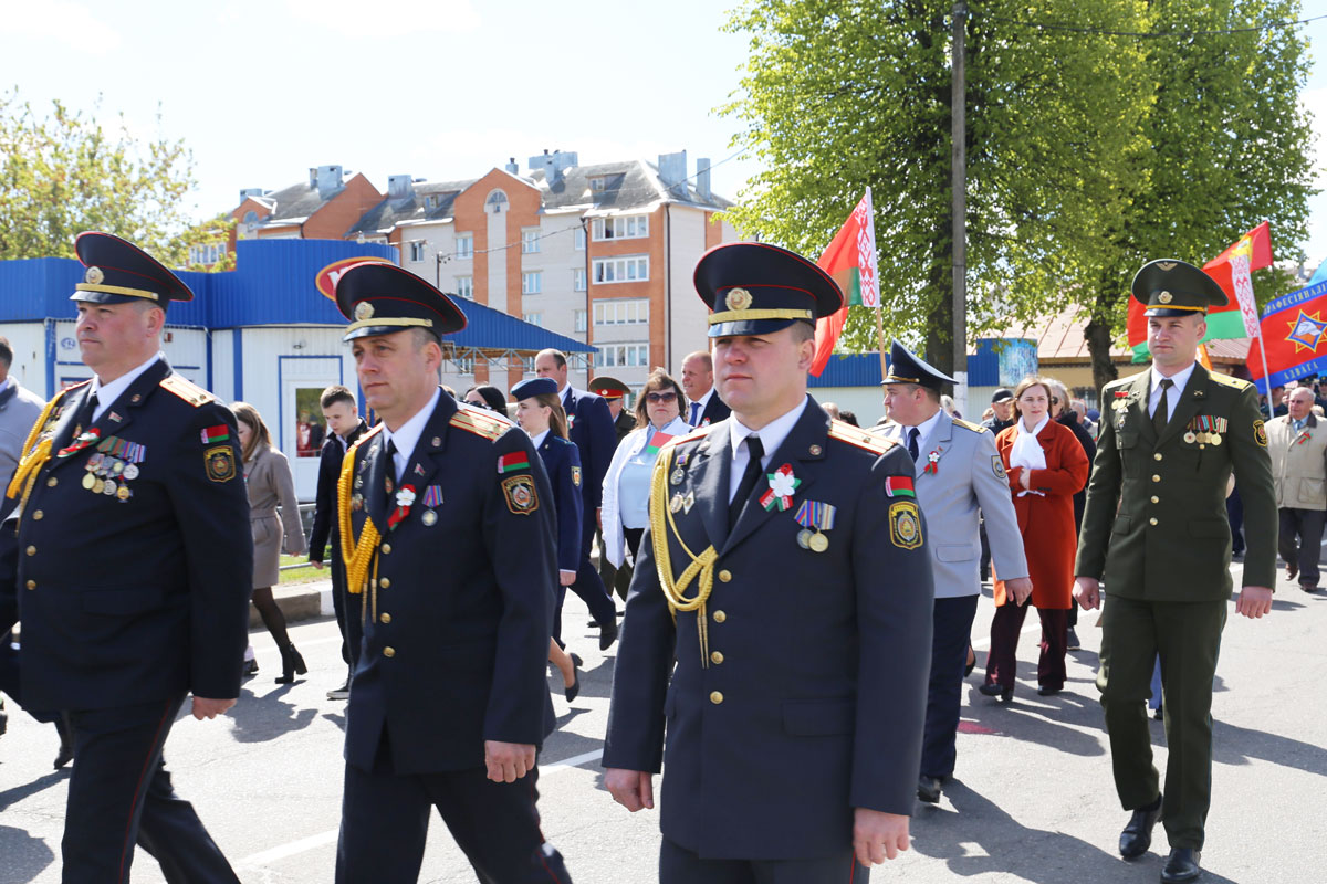В праздничной колонне на переднем плане (слева-направо): начальник ОВД Круглянского райисполкома Александр Дроздов, его заместитель по идеологической работе и кадровому...