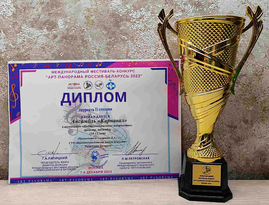 Буквально на днях (7 и 8 декабря) участники ансамбля «Карнавал» Круглянской ДШИ, руководитель ансамбля учитель по классу гитары Диана Смирнова и иллюстратор учитель по классу домры Наталья Бирюк посещали столицу Российской Федерации. Первоочередная цель поездки – участие наших юных музыкантов в международном фестивале-конкурсе «ART-PANORAMA Россия-Беларусь 2023», который проходил в культурном центре при Посольстве Республики Беларусь в Москве. Причём, наши конкурсанты вернулись оттуда с Дипломом лауреата II степени и кубком данного престижного фестиваля.