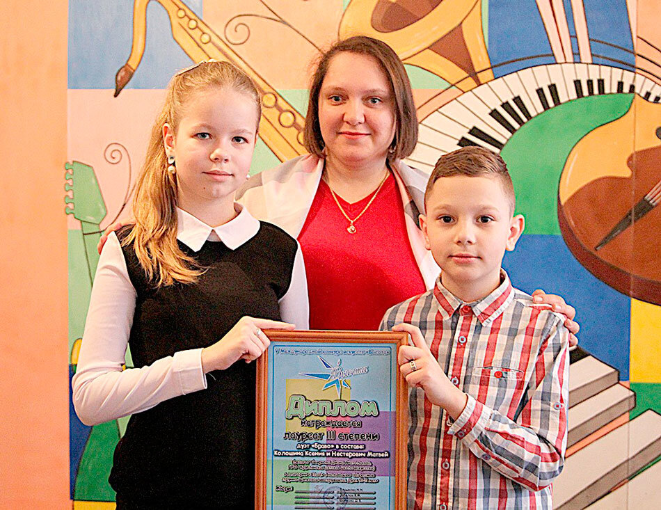 – Успешными для наших ребят были и выступления, подготовленные к Международному музыкальному конкурсу талантливых детей и молодежи «Моё поколение», – продолжает перечень заслуженных наград Андрей Андреевич. – В дипломанты І и ІI степеней вышли ансамбль «Субботея» (учитель Н.А. Бирюк) и Евгения Баенкова (учитель О.М. Минина). Наталья Александровна и Ольга Михайловна поощрены Благодарностями. Сразу несколько наших цимбалистов, занимающихся у О.М. Мининой, замечены и отмечены в рамках XXX Международного фестиваля-конкурса национальных культур «Радуга Дружбы» (г. Новосибирск, Россия): Дарья Чмырова – Диплом лауреата І степени, Александр Гончаров – Диплом лауреата ІІ степени, Анна Минина, а также дуэт цимбалистов в составе Надежды Гончаровой и Анны Снытко – Дипломы лауреата ІІІ степени.