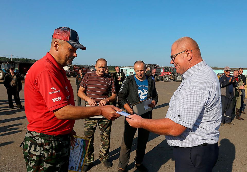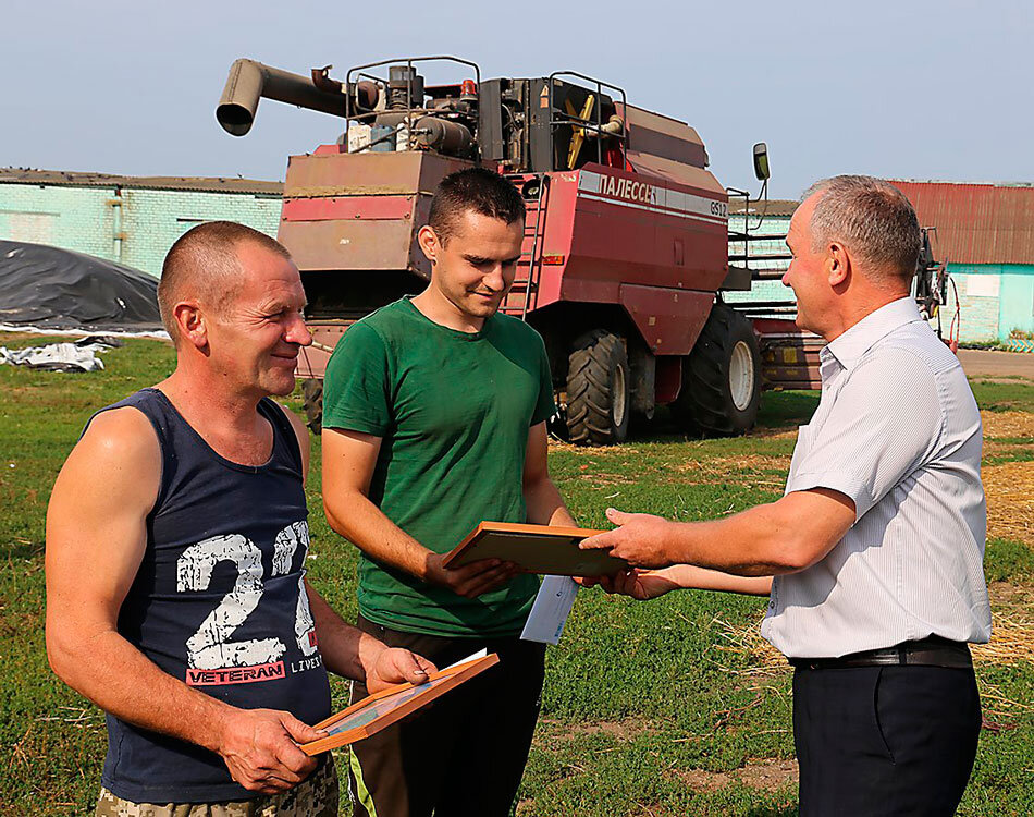 Он также принял участие в чествовании очередных «тысячников» — зерноуборочного экипажа в составе Петра Коробовича и Михаила Шаварова, водителя автомобиля МАЗ Андрея Гончарова. По состоянию на 19 августа они как раз замыкали районный список особо отличившихся на жатве-2021.
