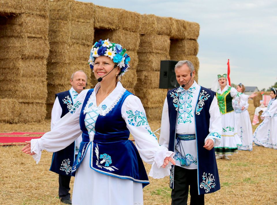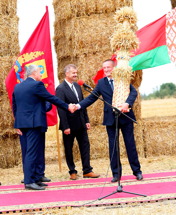 Апрача пісьмовай справа- здачы кіраўніку вобласці пад цёплыя воплескі прысутных уручаюцца адзін за адным тры галоўныя хлебаробскія сімвалы: сноп, мяшэчак з зернем і каравай новага ўраджаю.