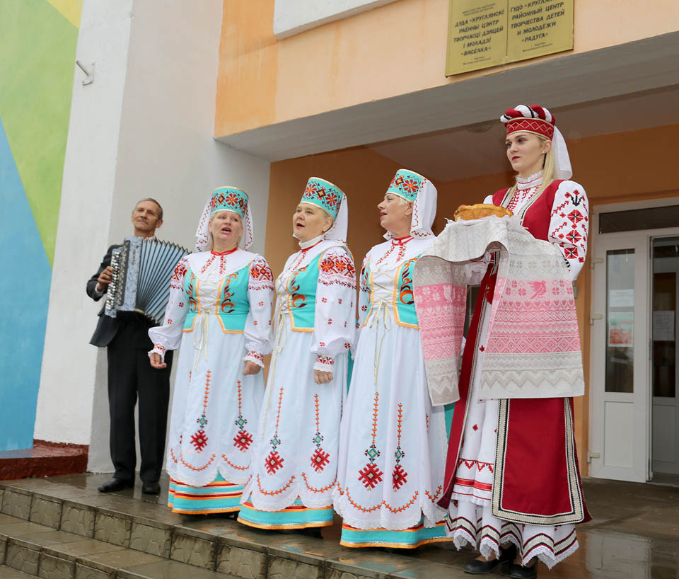Хлебным караваем и приветственным музыкальным номером их сердечно встречали на крыльце государственного учреждения дополнительного образования районного центра творчества детей молодежи «Радуга» круглянские женщины в национальных костюмах.