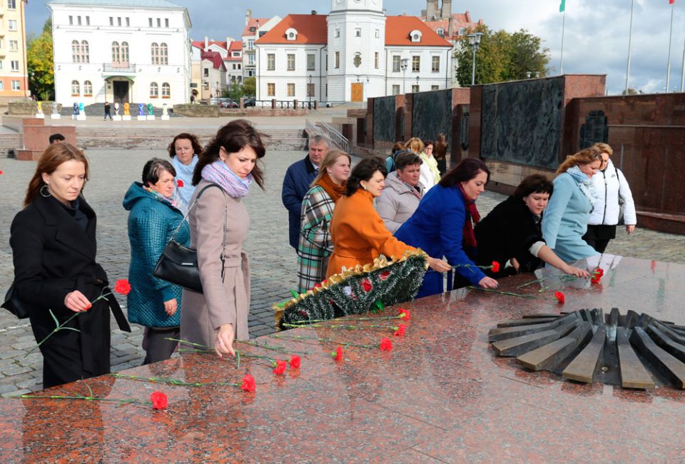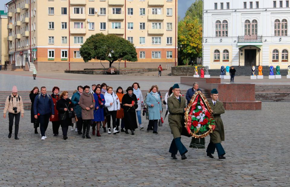 Завершающим пунктом на историческом маршруте стала площадь Славы. Среди главных её достопримечательностей – высотная городская ратуша (восстановлена в 2008 году) и мемориальный комплекс «Борцам за Советскую власть». Сюда, к Вечному огню, участники республиканского пресс-тура возложили венок и живые цветы. Комплекс включает в себя бронзовую скульптуру (на огромном постаменте) в виде женской фигуры, что символизирует образ Победы, и братскую могилу красноармейцев, погибших в 1920 году при защите города от польских войск.