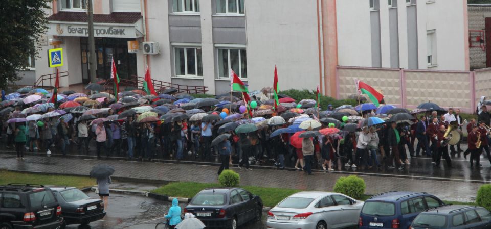 Дождь в минувшую среду зарядил с самого утра. Лишь изредка он немного затихал, словно давая небольшую передышку, и снова начинался. Но даже это обстоятельство никоим образом не помешало знаковому шествию круглянцев «Не дадим развалить страну!». Представители трудовых коллективов и общественность района вышли на главную улицу городского поселка, чтобы в единстве показать: нас много и мы – за мирную и стабильную Беларусь.