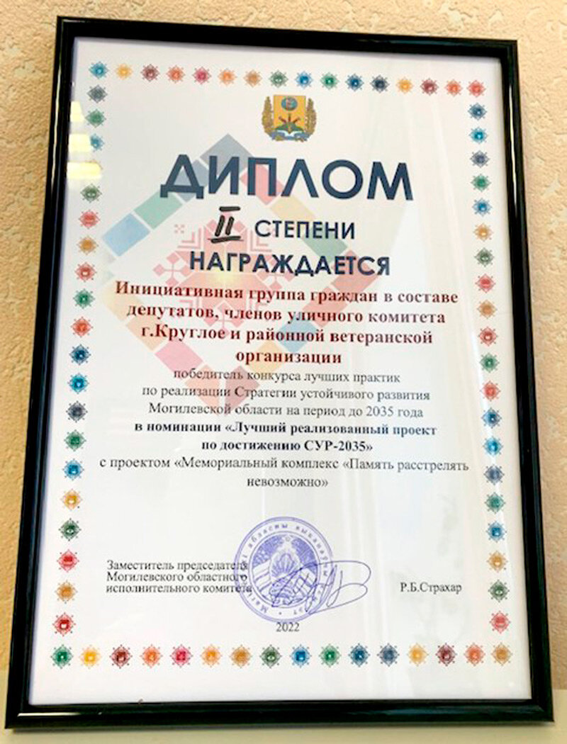 Приятно отметить, что в тройке сильнейших оказался проект «Память расстрелять невозможно» из Круглого, который по итогу конкурса отмечен Дипломом II степени. Защиту проекта представлял на форуме председатель Круглянского районного Совета депутатов Сергей Храмцов.