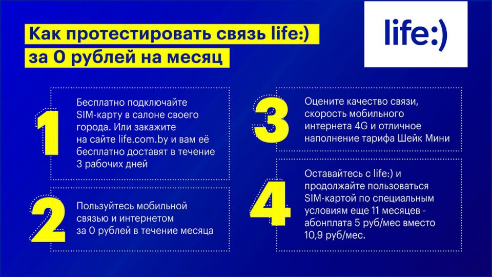 Для теста life:) предлагает тариф Шейк Мини с безлимитом интернета за 0 рублей на месяц. А после этого только для жителей Могилевской области абонентская плата составит 5 руб/мес вместо 10,90 еще на 11 месяцев! Кроме интернета и возможности делиться трафиком без ограничений, в тариф включены 300 минут для звонков во все сети. Бесплатно попробовать Шейк Мини в первый месяц могут все новые абоненты и бывшие клиенты, кто не с оператором больше трех месяцев. Тариф не предполагает каких-либо обязательств.