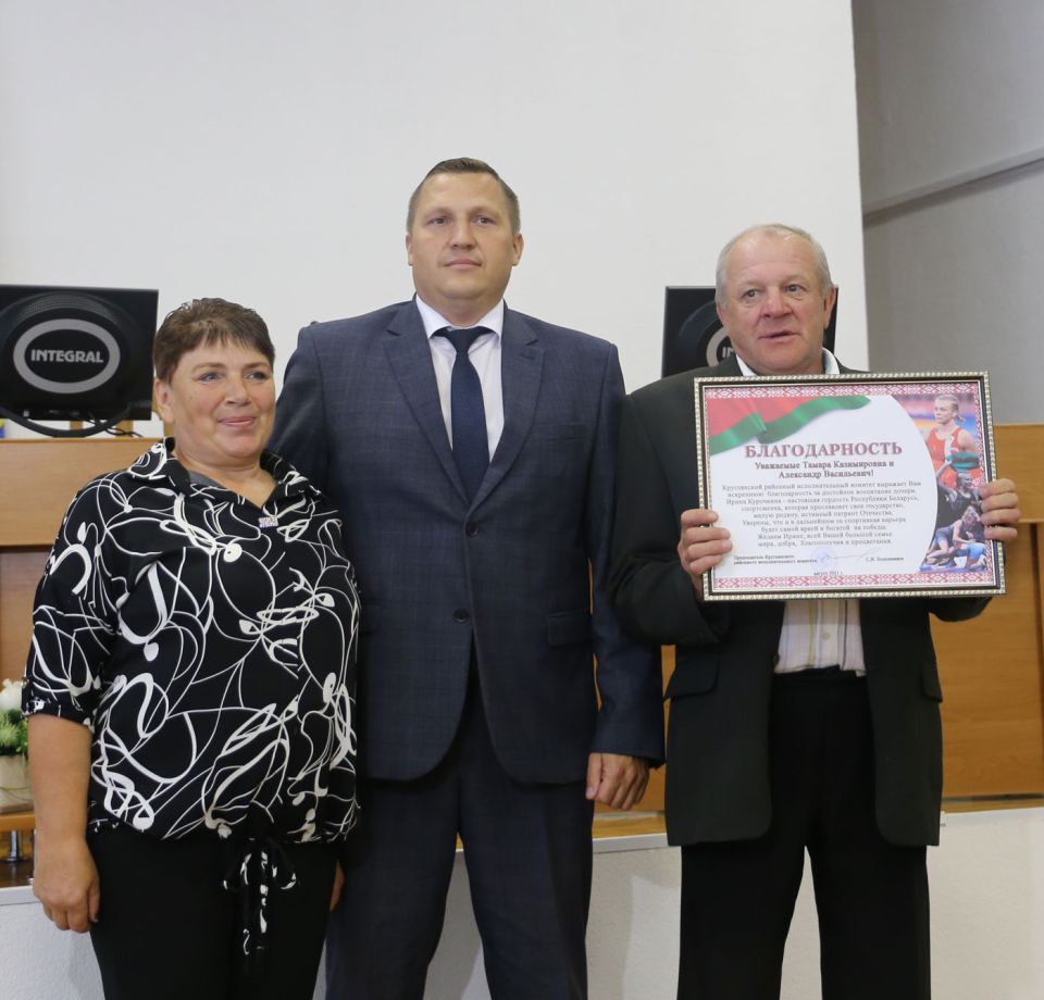 На официальном уровне чествование родителей победительницы Ирины состоялось сегодня в зале заседаний Дома Советов. Благодарственное письмо за подписью председателя Могилевского областного исполнительного комитета Леонида Зайца в торжественной обстановке супругам Курочкиным вручил заместитель председателя облисполкома, председатель Могилевской областной федерации борьбы Валерий Малашко. Также на мероприятии побывал и начальник управления спорта и туризма облисполкома, серебряный призер Олимпийских игр 2010 года в индивидуальной биатлонной гонке Сергей Новиков.