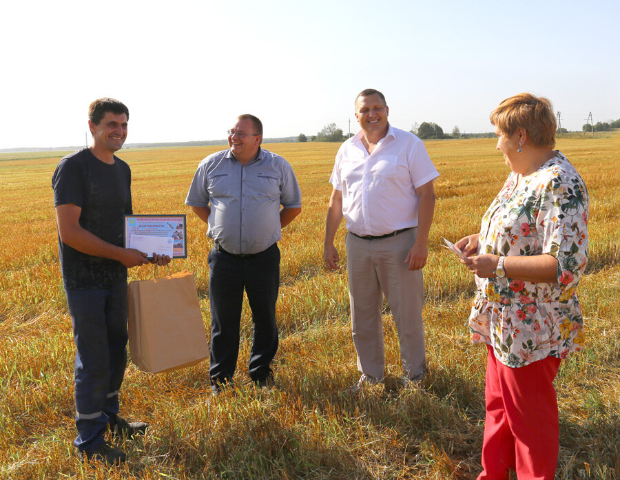 Далее эстафета приятной миссии поздравления по полям района передана первому заместителю председателя, начальнику управления сельского хозяйства и продовольствия райисполкома Алексею Гвоздеву. Он искренне поблагодарил за нелегкий труд экипаж из КСУП «Некрасово-Агро» в составе Андрея Киреева и Владимира Мазка.