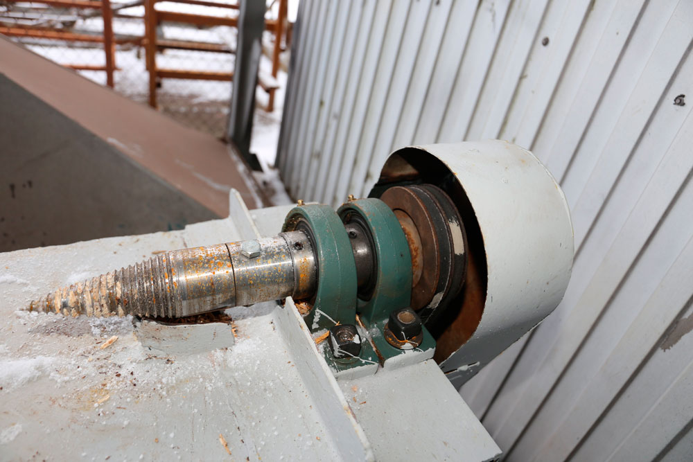 Предусмотрены и специальные гнезда для крепления электродвигателя, подшипников и, конечно же, главного механизма всей этой конструкции – своеобразной металлической «морковки» с конусной резьбой. Благодаря этой резьбе, полено постепенно и насаживается, и расщепляется изначально. Далее справиться с древесиной помогает приваренный к столешнице неказистый на первый взгляд металлический клинок, напоминающий грубый топор-колунок. Перед такими крутящимися-давящими механизмами не устоит даже дубовая древесина.