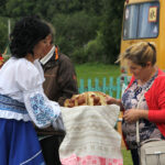 Но особое внимание, несомненно, уделялось жителям деревни Рубеж. Звучат фанфары. Под приветственные слова и музыку девушки в национальных костюмах угощают всех присутствующих караваем, как символом щедрости и гостеприимства рубежской земли.