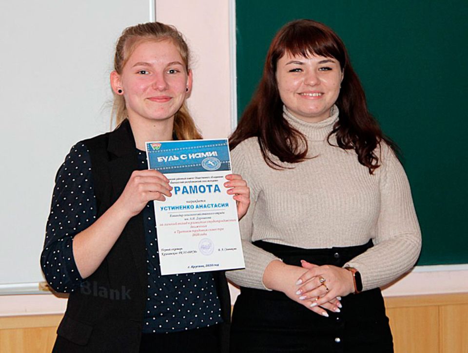 Встреча со школьниками завершилась на торжественной ноте – награждением активистов студотрядовского движения. К слову, на базе данного учреждения образования сформирован и не первый год работает сельскохозяйственный отряд имени Героя Советского Союза Г.И. Шибанова. По итогам третьего трудового семестра-2020 лучшим в районе признан именно этот отряд, представителям которого передан Диплом победителя, памятный сувенир и торт с надписью «Труд крут». Всем участникам данного отряда за личный вклад в развитие студотря- довского движения вручены грамоты райкома ОО «БРСМ». Не остался без внимания и второй молодёжный отряд Комсеничского УПК (отряд имени А.И. Дорошкова), работавший прошедшим летом на зернотоке ОАО «Круглянская Искра». Его труженики также поощрены именными грамотами от РК ОО «БРСМ» и сладким угощением.