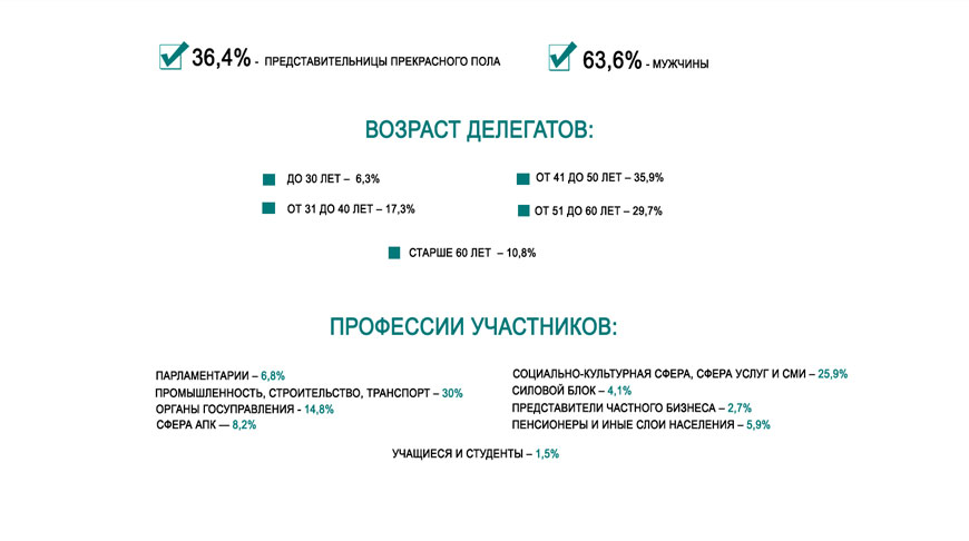 На этот раз делегатами выбраны 2,4 тыс. человек. С учетом приглашенных общее количество участников ВНС достигает 2,7 тыс. Традиционно это представители всех слоев общества и регионов. В частности, среди делегатов парламентарии составляют 6,8%, представители промышленности, строительства, транспорта — 30%, органов госуправления — 14,8%, АПК — 8,2%. Социально-культурную сферу, сферу услуг и СМИ на ВНС представят 25,9% от общего числа участников, силовой блок — 4,1%, частный бизнес — 2,7%. От пенсионеров делегированы 5,9%, от учащихся и студенчества — 1,5%.