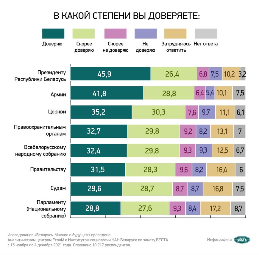 «Как показывают результаты масштабного социологического исследования, история суверенной и независимой Беларуси рационально философски осмысливается гражданами и рефлексивно белорусским народом воспринимается как цивилизационное достижение и воплощение многовековой мечты о создании своей государственности. Такие цифры, как 57,3% доверия государственным служащим, 56,8% — местным органам власти, 52,9% — ЦИК, говорят о востребованности в белорусском обществе стабильности через решение насущных проблем посредством властей на местах», — подчеркнул Николай Щекин.