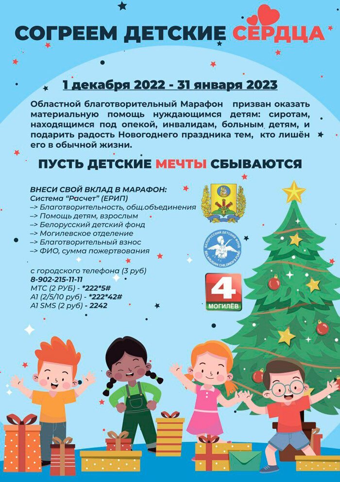 11-й областной благотворительный марафон «Согреем детские сердца» проходит в Могилевской области с 1 декабря 2022 года по 31 января 2023 года.