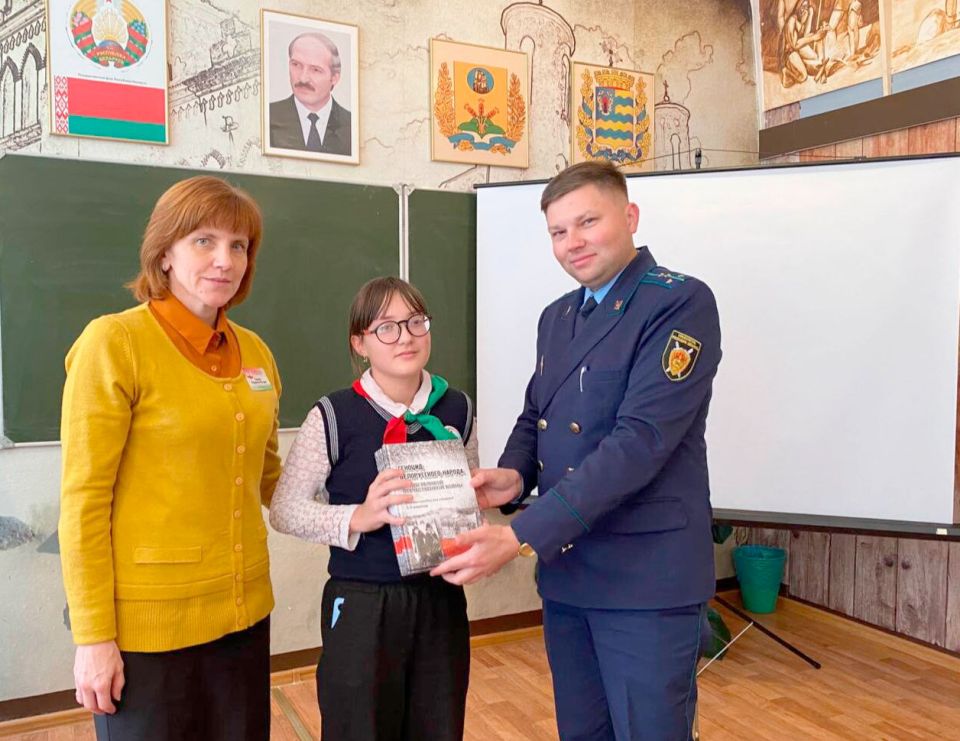 В завершении встречи учащимся были вручены учебные пособия «Геноцид белорусского народа в годы Великой Отечественной войны», подготовленные Министерством образования по инициативе и непосредственном участии Генеральной прокуратуры.