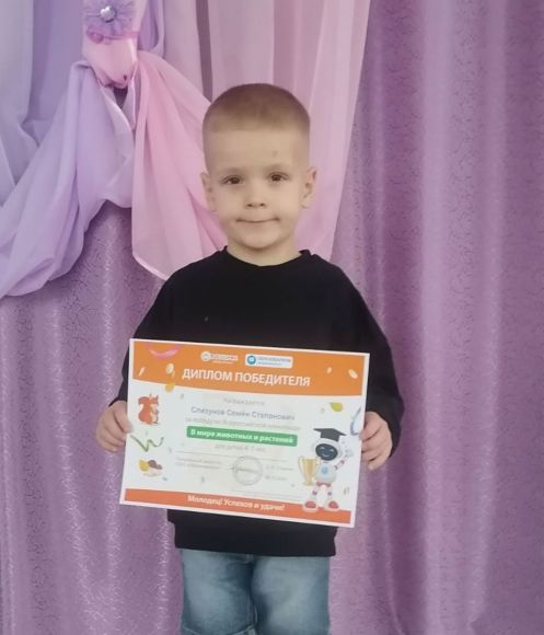 Участие во всероссийской онлайн-олимпиаде «В мире животных и растений» принесло победу воспитаннику старшей группы Семёну Слизунову, который получил Диплом победителя.