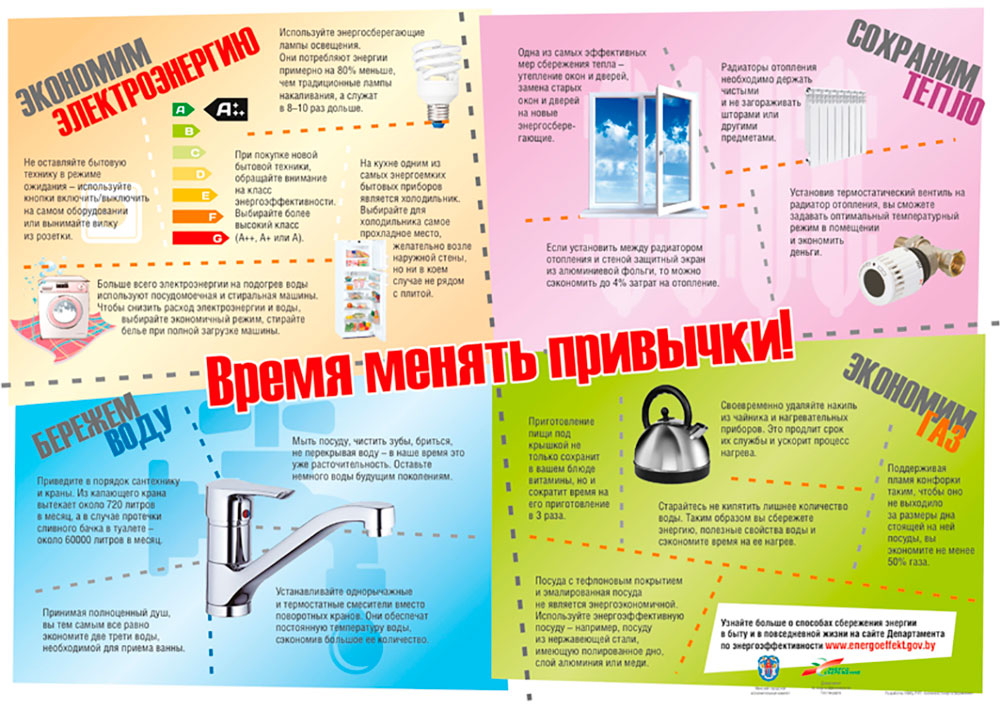 Справочно: дополнительные информационные материалы размещены на интернет сайте Департамента по энергоэффективности (http://energoeffekt.gov.by/) в разделе «Популярно об энергосбережении/Полезные советы», а на официальном YouTube-канале Департамента – социальные видеороликов по энергосбережению.