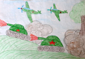 Война глазами детей… Это страшно и по-особому волнительно, хотя понимаешь, что ребенок дает только воображаемый рисунок на основе увиденного в кино, прочитанного в книгах, услышанного в рассказах дедушек и бабушек…