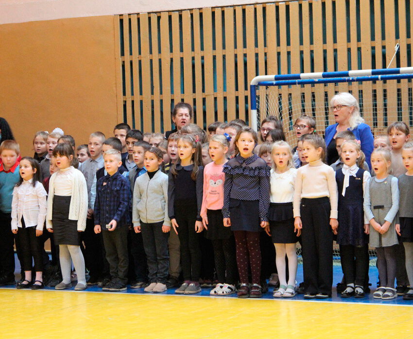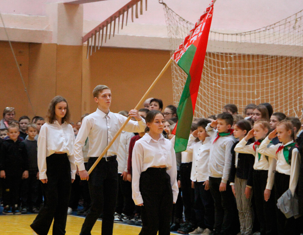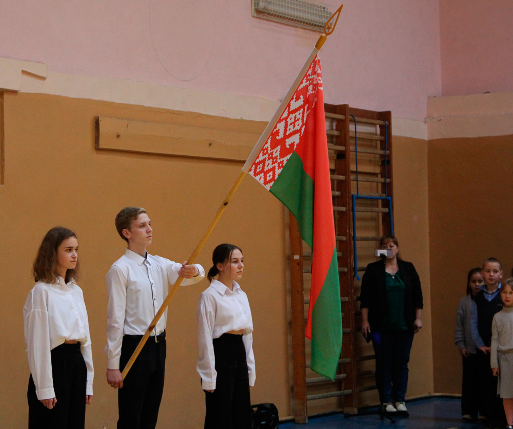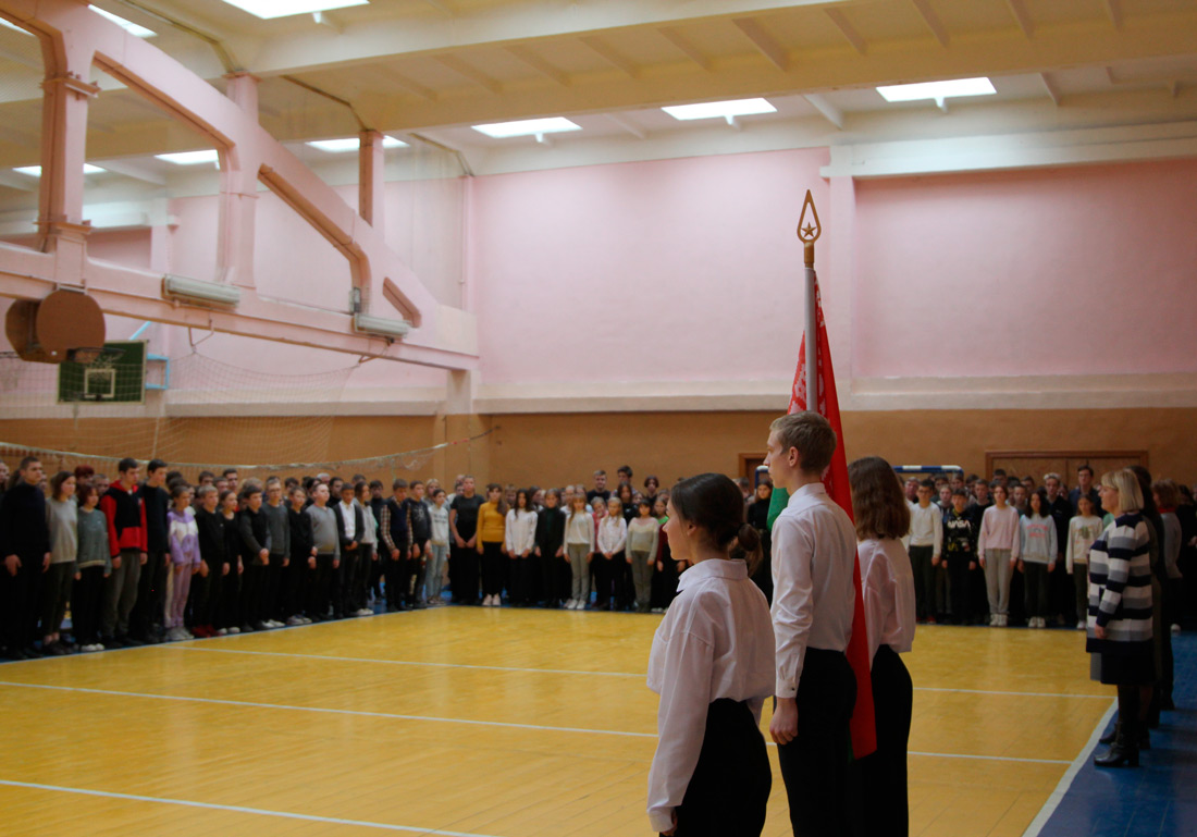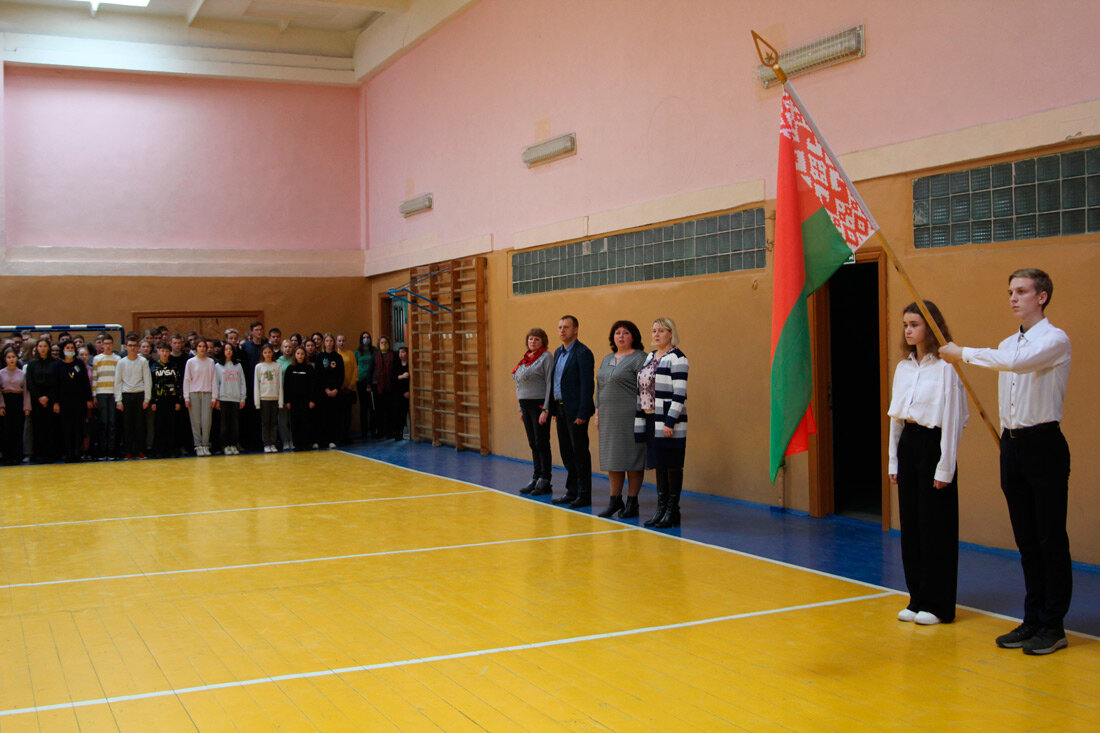 В спортивном зале учреждения образования в полном составе собрались администрация, педагоги и учащиеся. После общего построения и команды «Равнение на флаг!» все вместе они исполнили гимн Республики Беларусь.