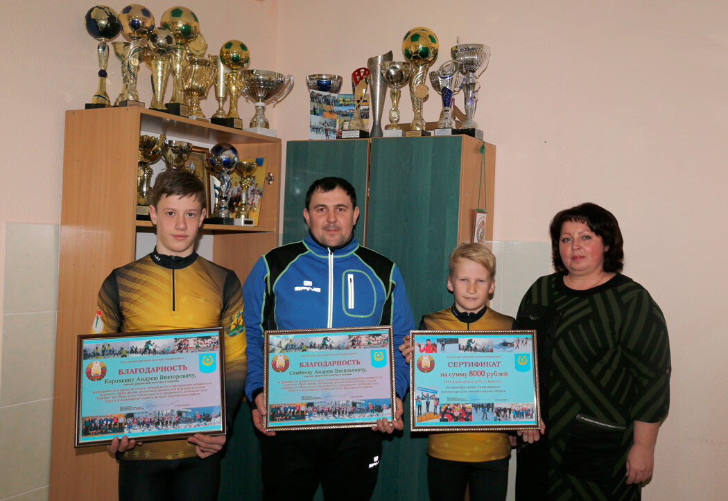 Сертификат на приобретение спортивного инвентаря для зимних видов спорта вручается ГУО «Средняя школа №2 г. Круглое». Его с благодарностью принимают директор Лилия Симонович, преподаватели и юные воспитанники.